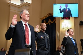 U.S. Customs and Border Protection Commissioner Rodney Scott, director of U.S. Citizenship and Immigration Services Joseph Edlow, and Acting Director of U.S. Immigration and Customs Enforcement Todd Lyons watch a video clip during a House Homeland Security Committee hearing on Feb. 10, 2026 in Washington, DC. The Department of Homeland Security has faced criticism over law enforcement tactics targeting undocumented immigrants and the killing of two U.S. citizens in Minneapolis. (Photo by Samuel Corum/Getty Images)