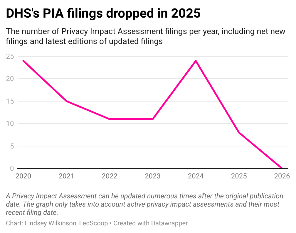 PIA filings dropped in 2025 to just eight, after hitting a 2020 peak of 24 in 2024, according to FedScoop’s analysis of 217 active PIAs across four relevant sections. There haven’t been any PIAs filed this year.
