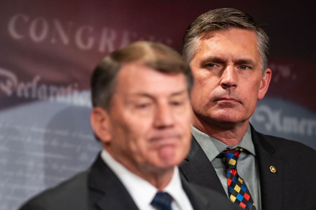 Sen. Martin Heinrich, D-N.M., listens as Sen. Mike Rounds, R-S.D., speaks during a news conference at the Capitol on May 15, 2024 in Washington, D.C. (Photo by Kent Nishimura/Getty Images)