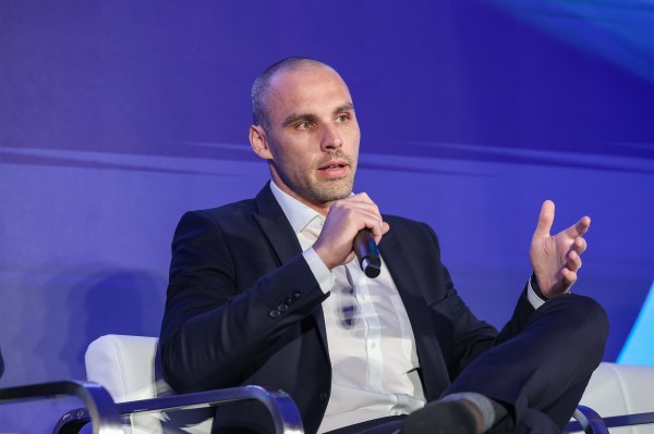 A woman walks under a sign of big data analytics Palantir at their stand ahead of the World Economic Forum (WEF) annual meeting in Davos on May 22, 2022. (Photo by FABRICE COFFRINI/AFP via Getty Images)