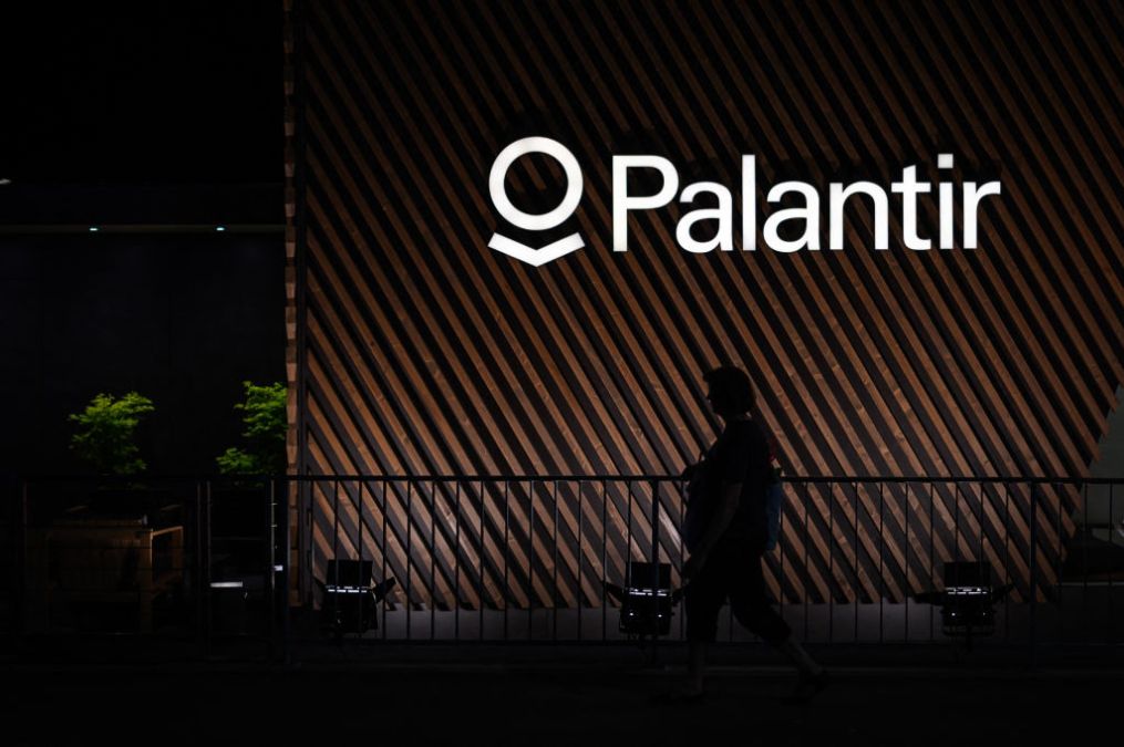 A woman walks under a sign of big data analytics Palantir at their stand ahead of the World Economic Forum (WEF) annual meeting in Davos on May 22, 2022. (Photo by FABRICE COFFRINI/AFP via Getty Images)